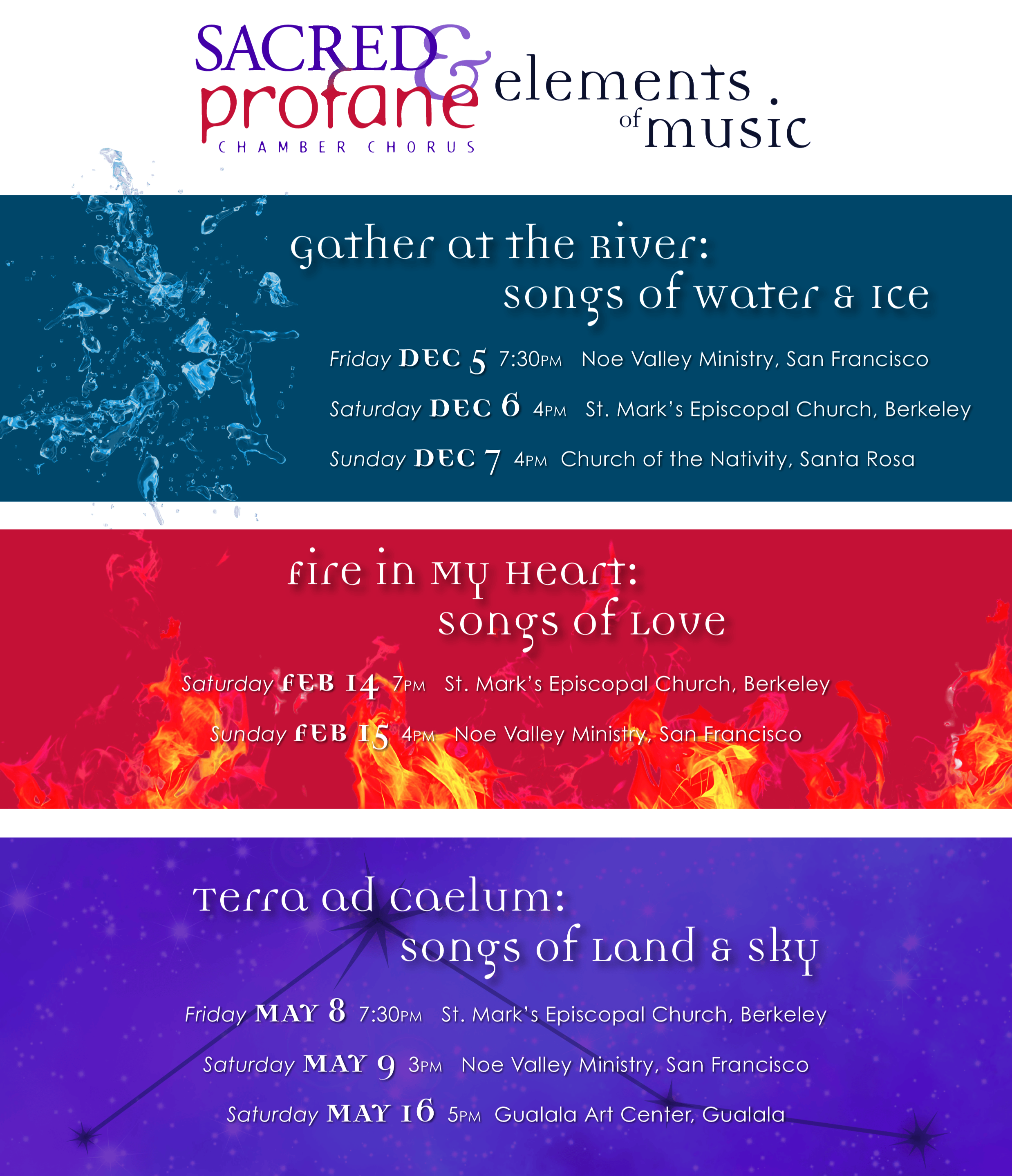 Sacred and Profane Chamber Chorus invites you to celebrate the natural world and explore the classic elements of the universe in our 2025-2026 season! Be reflected in pools of water, ice, and snow in December; feel the heat of love’s flame in February; and ground yourself with earth and breathe the fresh air in May. This ticket package offers admission to one performance of our programming for each concert series (excludes the Saturday, May 16 concert at Gualala Art Center).